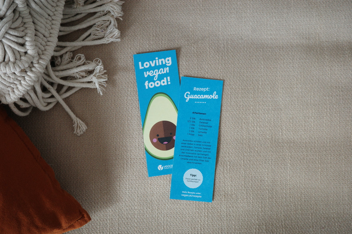 Lesezeichen „I Love Vegan Food“ mit Rezept.